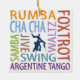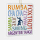 Ballroom dance colorful word art design with image of a couple ballroom dancing and fun lettering for dance styles like rumba, foxtrot, waltz, cha cha, samba tango, jive and swing.