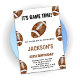 Plain white envelopes are included with paper invitations and will come to fit the invitation size you select. If you don’t need the envelopes, you may choose to not receive them by selecting the dropdown below "Envelopes" and choosing "None." If you’d like to have a design on your envelopes, you can browse all of these available envelopes to find the design that complements your Balls Football Birthday Invitations.