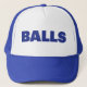 BALLS BALLS fun and ironic slogan on trucker hat, blue, funny typographic statement, inspired by tv comedy character frank rossitano. ballsy move.