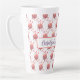 Knitting yarn and needles tall latte mug with place to personalize with a name or short saying. Pink and purple colors. Sample text is “{Name's} knitting spirits” in purple script in the center of a white mug. Two knitting needles stuck into a ball of variegated yarn make a fun pattern around a tall or short mug.