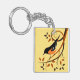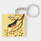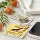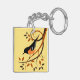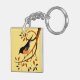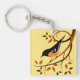 Decorative bird art on keychains of Baltimore Oriole perched on stylized branched with patterned leaves