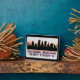 Tabletop plaque features Baltimore Maryland city skyline silhouette with watercolor splash and latitude & longitude map coordinates
