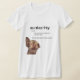 My overall review is that the T-shirt is nice, it fits true to size however the font is significantly smaller than advertised and you can't read it. The printing is unreadable and there is a strain to read it. It does not look like the advertised product. Maybe the shirt color is darker or a larger more visible font should have been used. Photos with and without flash and font is barely legible.