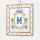 This chic design features a Bamboo Crest with a blue bow surrounded by orange tree topiaries in chinoiserie pots. There is a bamboo frame around the outside edge. You can personalize with your monogram.