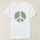 A t-shirt for peace, with a repeat pattern of the ban the bomb symbol. The peace symbols are colored yellow, blue, red and green.