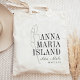 Welcome guests to your destination wedding with these chic and modern personalized tote bags. Design features a dark green tropical banana leaf illustration with your wedding destination aligned at the right (shown with Anna Maria Island) in classic serif lettering. Add your names beneath in handwritten cursive script, as well as the year. Leaf position can be adjusted, and colors can be changed to match your wedding colors using Zazzle's design tool.