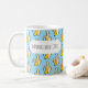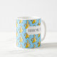 Are you bananas about coffee? A mug featuring the caption "BANANAS ABOUT COFFEE" over a lively pattern of stylized pixel art yellow bananas on a sky blue background.