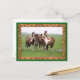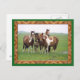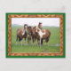 A group five Appaloosa brown and white horses standing together in a green field.With a baby colt.This postcard has a wood floor brown frame and the forest green background. The background color can be change to any color you want it to be with the custom tag.This postcard you can add text at the same time..