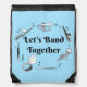 Let's band together text surrounded by a circle of instruments and music notation is a musical twist on a common phrase and a funny gift design for concert and marching band musicians.