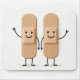 Two playful adhesive bandages, designed as smiling characters with arms and legs, are posed against a neutral background