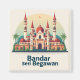A colorful grand mosque in Bandar Seri Begawan featuring red domes, tall minarets, arched entrances and palm trees set against a warm sunset backdrop.