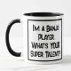 Funny slogan on a Two Tone Coffee mug that says "I'm a Banjo Player. What's YOUR super talent?". Two Tone Coffee Mug for a Banjo Player or someone who plays the banjo. Black and white bold text.