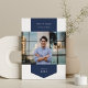 Customize this modern graduation announcement with a horizontal or landscape oriented photo overlaid on a ribbon banner in classic navy blue. Add your graduate's name, school, and graduation year. Personalize the back with an additional photo and a personal message.