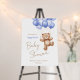 Banners board for baby shower decorated with an adorable teddy bear riding balloons in the clouds.