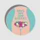 Pro Choice protest car magnet features woman body illustration with flowers and "bans off our bodies" text on aqua background.