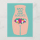 Pro Choice protest postcard features woman body illustration with flowers and "bans off our bodies" text on aqua background.