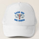 Pro-choice word art trucker hat features "bans off our bodies" in retro style blue text with floral uterus graphic.