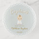 This beautiful and sweet baby is perfect for your child’s Baptism. The design consists of a sweet baby wearing a white jumpsuit, white bib with a gold cross. The background color is a delicate powder blue. Check out the matching accessories, gifts, party favors and stationery.