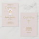 This beautiful and sweet baby is perfect for your child’s Baptism. The design consists of a sweet baby wearing a white jumpsuit, white bib with a gold cross and a white bonnet with a pink bow. The background color is a delicate pink. Check out the matching accessories, gifts, party favors and stationery.