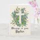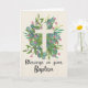 This Baptism card is for a girl and has eucalyptus and ferns arranged under a simple cross. The text reads ‘Blessings on your Baptism.’