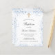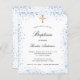 A modern, elegant baptism, celebrating a baby boy. A stylish white background decorated with blue faux glitter dust and a golden cross. Personalize and add a name and party details. Black colored letters.