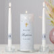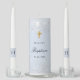 A light blue background, decorated with faux silver glitter dust and a golden cross. Personalize and add a name, monogram initial and a date.