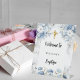 Blue florals, flowers, marble print as background and a white arch shaped frame. A golden cross. Personalize and add a name.