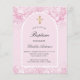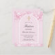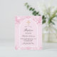 A blush pink background and an arch frame. Decorated with pink confetti. Personalize and a name and ceremony details. Elegant hand lettered style script.