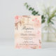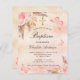 A rose gold, blush pink rustic background. Decorated with rose gold and pink florals, roses, pampas grass, butterflies and a golden cross. Personalize and add a name and the details.