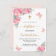 A white background decorated with pink florals and butterflies. Personalize and the childs name and ceremony details. Black and golden colored letters.
