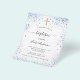 A modern, elegant baptism, celebrating a baby boy. White background decorated with blue faux glitter dust and a golden cross. Personalize and add a name and party details. Black colored letters.