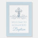 Boy baptism welcome sign with pretty blue cross on a blue and white background. This blue cross baptism sign is easily customized for use as a christening, first communion or confirmation sign by simply adding your text.
