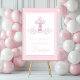 Girl baptism welcome sign with pretty pink cross on a pink and white background. This pink cross baptism sign is easily customized for use as a christening, first communion or confirmation sign by simply adding your text. You can also change the background color.