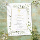 Featuring delicate watercolor greenery leaves and an elegant gold crucifix, this chic gender neutral baptism or christening invitation can be personalized with your special information, with a silver sage background on the reverse. Designed by Thisisnotme©