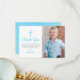 Thank your family and friends for attending your baby boy's first birthday and baptism with a photo of your child. The blue design features white polka dots on a blue watercolor background on the back of the card. All of the text can be customized, including your child's name and the message.