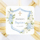 A white background. Decorated with a pink crest, blue and white flowers, florals. With a golden cross.