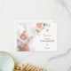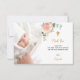 A modern and elegant baptism thank you card. A chic white background decorated with a watercolored blush pink, rose gold floral, eucalyptus greenery and faux gold leaves. Personalize and add your photo of the child, thank you note and name.