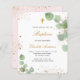 A white background decorated with eucalyptus greenery and faux gold glitter dust. Personalize and the childs name and ceremony details. Black and golden colored letters.