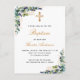 A white background decorated with eucalyptus greenery and golden leaves and a golden cross. Personalize and the childs name and ceremony details. Black and golden colored letters.