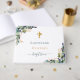 For an elegant baptism, gender neutral. A chic white background. Decorated with green eucalyptus greenery and faux gold foliage. A faux gold cross. Personalize and add the name of the child and a date. Green and golden letters.