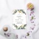 A white background decorated with eucalyptus greenery and golden leaves and faux gold glitter drops. Personalize and the child's name and ceremony details. Black and rose colored letters. The rose gold text is written with real foil.