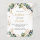 A white background decorated with eucalyptus greenery and golden leaves and faux gold glitter drops. Personalize and the childs name and ceremony details. Black and golden colored letters.