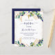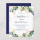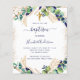 On the front: a white background decorated with eucalyptus greenery and golden leaves and faux gold glitter sparkles. A golden cross. Personalize and the child's name and ceremony details. Blue text.