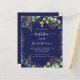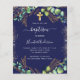 A navy blue background decorated with eucalyptus greenery and golden leaves and faux gold glitter sparkles. A golden cross. Personalize and the child's name and ceremony details.