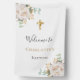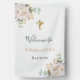 Welcome to an elegant baptism, gender neutral. A chic white background. Decorated with a watercolored white rose and green eucalyptus leaves, sprigs, greenery, faux gold leaves. A faux gold cross. Personalize and add the name of the child