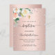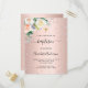 A rose gold faux metallic looking background decorated with flowers in white and blush pink and faux diamonds. Personalize and the childs name and ceremony details. Black colored letters.