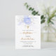 For an elegant baptism, celebrating a baby boy. A chic white background. Decorated with light blue and white florals, roses and a faux gold cross. Personalize and add the name of the child and details. Black and golden letters.
