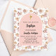 An arch frame on a pattern of pampas grass and pink flowers and a golden cross. Personalize and add a name and details.