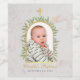 There is a baby photo in a faux gold foil arch frame, with green leaves around the arch. Above it, there is a cross, also faux gold foil. Under it, the name and occasion are written in a golden calligraphic script, the date in small black caps. The background is white marble.