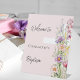 A light pink background, decorated with summer flowers, wildflowers in pink and purple with a large white cross. Personalize and add a name.